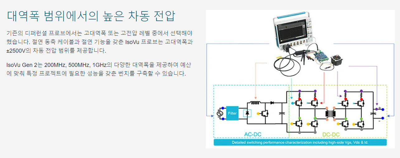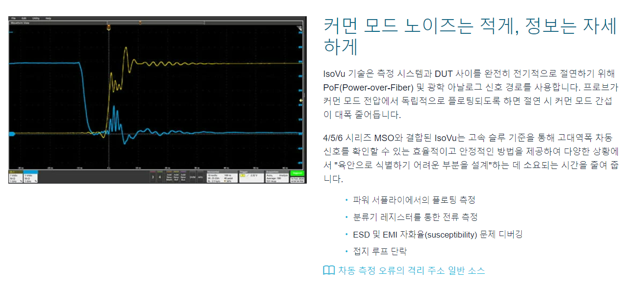 절연되지 않은 프로브가 숨기고 있는 빠른 플로팅 신호를 발견해 보십시오. IsoVu™ 프로브 기술은 광학적 절연 기능을 사용하여 커먼 모드 간섭을 거의 제거합니다. 이를 통해 100V/ns 이상의 속도에서 ±60kV 회전하는 기준 전압에 대해 정확한 차동 측정값을 제공합니다. 당사의 IsoVu 2세대 설계를 사용하면 1/5의 크기로 IsoVu 기술이 지닌 모든 이점을 누릴 수 있습니다.