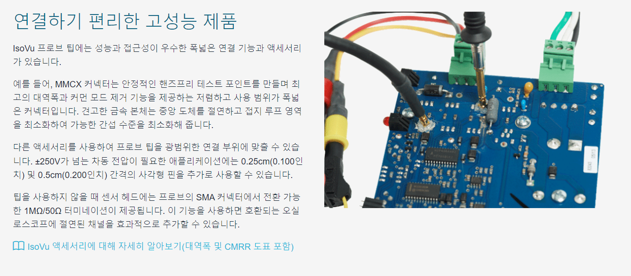 다기능 MMCX 커넥터를 갖추고 탁월한 대역폭, 동적 범위, 커먼 모드 제거 기능이 결합된 IsoVu Gen 2 프로브는 절연된 프로브 기술에 새로운 표준을 만들어 가고 있습니다.