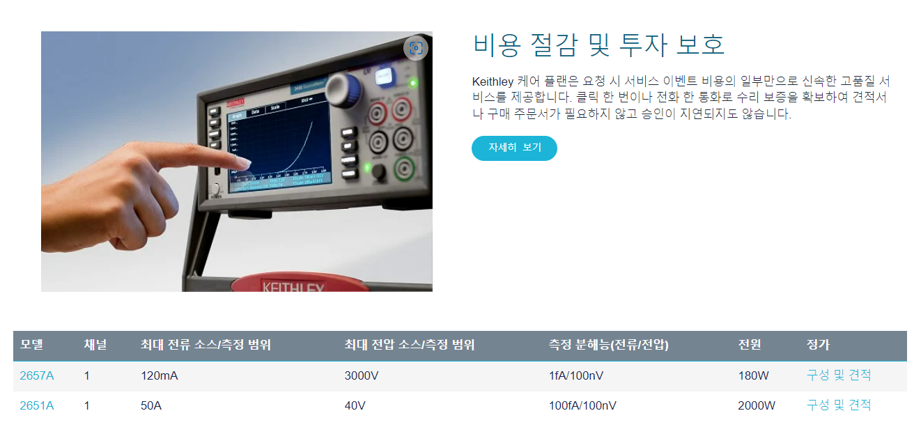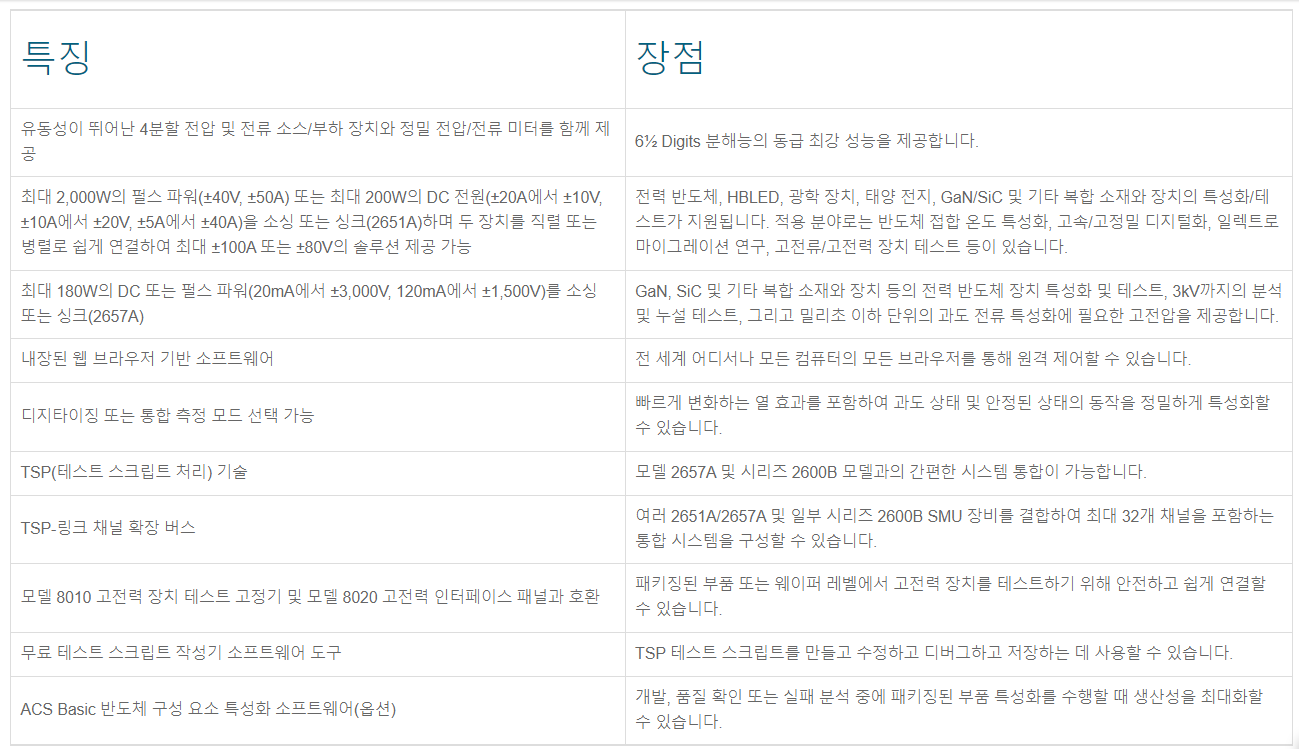 2650 시리즈 고전력 SourceMeter SMU 장비는 특별히 고전압/전류 전자 장치 및 전력 반도체(예: 다이오드, FET, IGBT, 고선명도 LED, DC-DC 컨버터, 배터리, 태양 전지, 기타 고전력 소재, 구성 요소, 모듈, 서브 어셈블리)의 특성화 및 테스트를 위해 설계되었습니다. 이러한 SMU 장비는 뛰어난 전력, 정밀도, 속도, 유연성, 및 사용 편의성을 제공하여 연구 개발, 프러덕션 테스트 및 안정성 환경에서 생산성을 개선합니다. 최대 3,000V 또는 최대 2,000W의 펄스 전력을 제공하는 두 가지 장비를 사용할 수 있습니다.