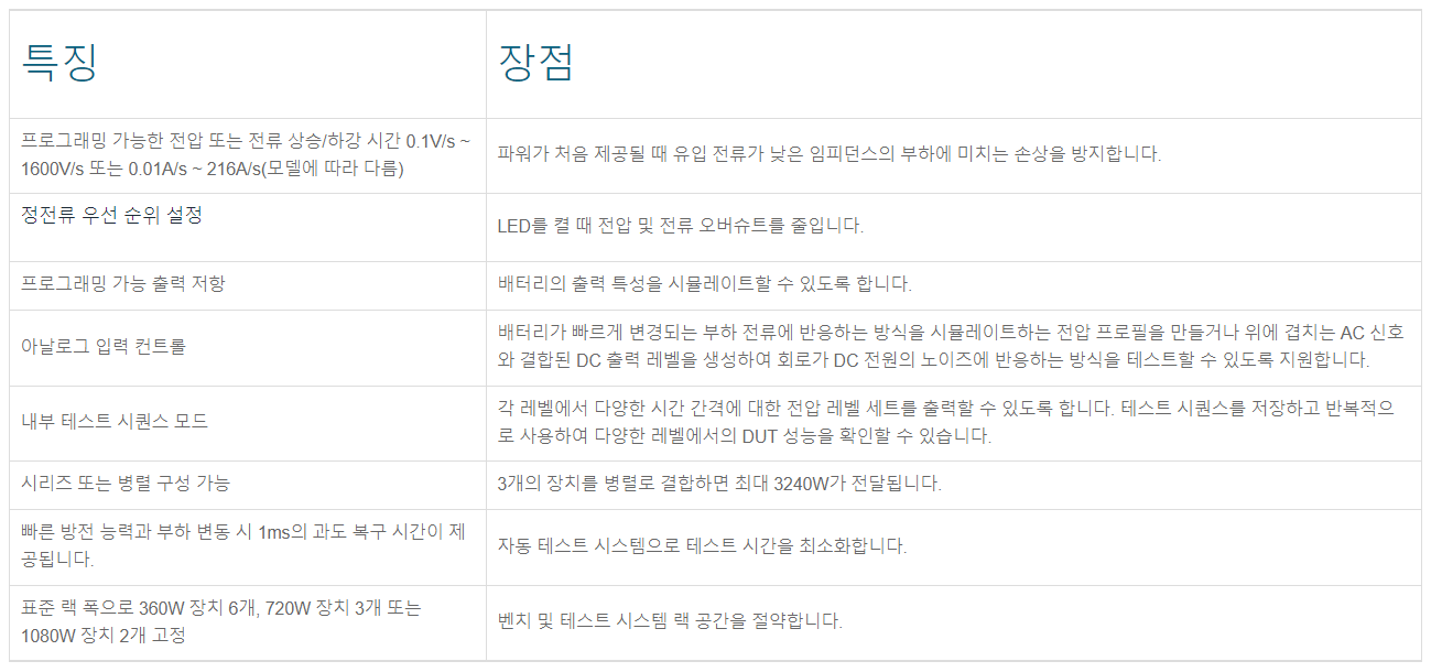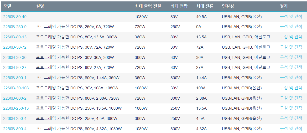 360W, 720W 또는 1080W 시리즈 2260B 프로그래밍 가능 DC 파워 서플라이를 갖는 다양한 전압 및 전류를 제공합니다. 360W 버전은 36A, 전류를 13.5A, 4.5A 또는 1.44A로 출력 가능하고, 720W 모델은 72A, 27A, 9A 또는 2.88A로 출력 가능하며, 1080W 장비는 108A, 40.5A, 13.5A 또는 4.32A로 출력 가능합니다. 이러한 광범위한 출력 전압과 전류가 여러 인터페이스 옵션과 결합되어 시리즈 2260B는 연구 및 설계, 품질 제어, 생산 테스트를 비롯한 다양한 적용 분야에서 사용하기에 적합합니다.
