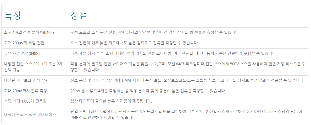 비용 효율적인 5½ Digits 모델 6485 피코암미터는 초당 최대 1,000개 판독값을 제공하는 속도로 10fA~20mA 범위의 전류를 측정할 수 있습니다. 모델 6487 피코암미터/전압 소스는 6485보다 더 높은 정확도와 더 빠른 상승 시간, 500V 소스 및 용량 장치에 사용하기 위한 댐핑(damping) 기능을 제공합니다. 모델 6482 듀얼 채널 피코암미터/전압 소스는 모델 6485 또는 모델 6487보다 더 높은 측정 분해능과 독립적인 이중 30V 전압 바이어스 소스를 제공합니다.
